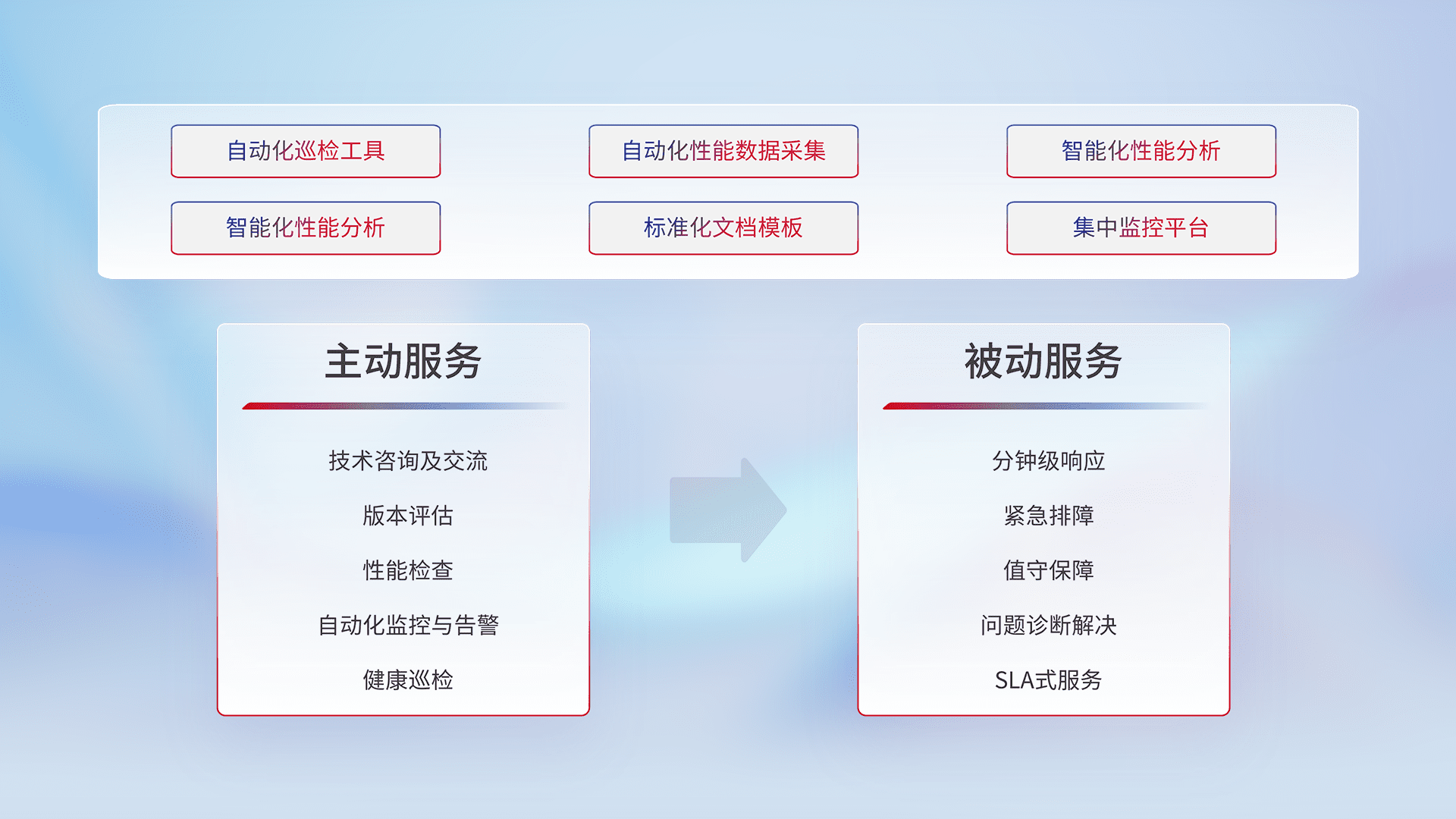 智能化工具和标准化文档,,,保障服务质量,,提供主动服务(包含技术咨询、、、版本评估、、、性能检查、、、自动化监控与告警、、、、健康巡检)和被动服务包含(分钟级响应、、、紧急排障、、、、值守保障、、、问题诊断解决、、、、SLA服务)。。